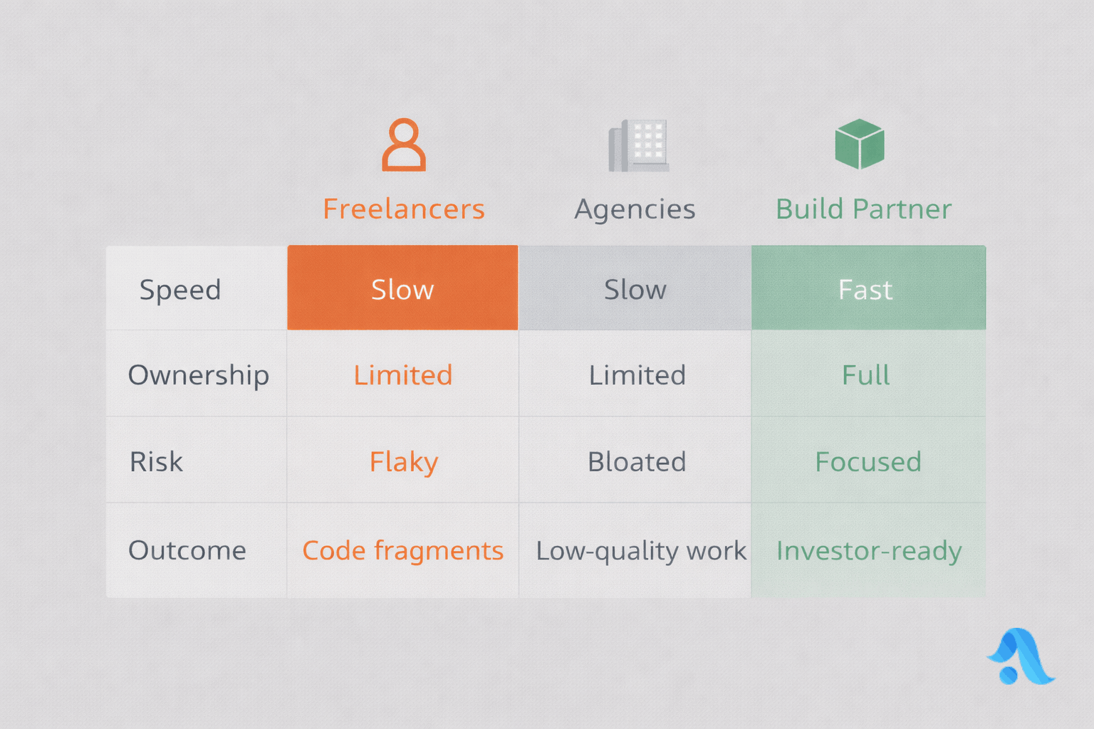 A clear, founder-to-founder breakdown of freelancers, agencies, and SaaS build partners, and how to choose the right execution model without wasting time or runway.